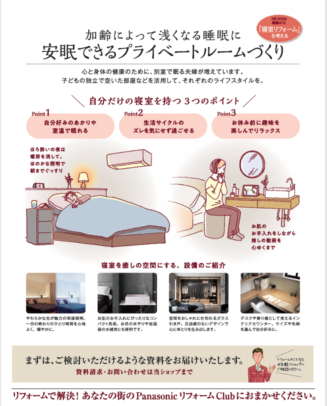 ブログ / 新着情報 2026年2月6日 2026年2月6日 最近は寝室を別にするご夫婦が増えているのはご存じですか? 睡眠の質が上がったと感じられる方もいらっしゃるそうです。 生活リズムや空調などの好みの違い、いびきなど音の問題を解決したい・・・ 実は長年思っておられませんか? お子様の独立で空いた部屋を活用するなど、自分専用のスペースを設けて 誰にも気兼ねせず趣味の時間を楽しむ事もできますね。 自分だけのこだわりがつまった寝室は、心地よく眠るだけでなく 健やかに暮らすことにもつながります。